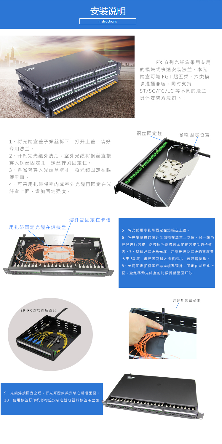 殼體采用靜電噴塑,外形美觀,內(nèi)配光纜固定裝置,熔接盤(pán)