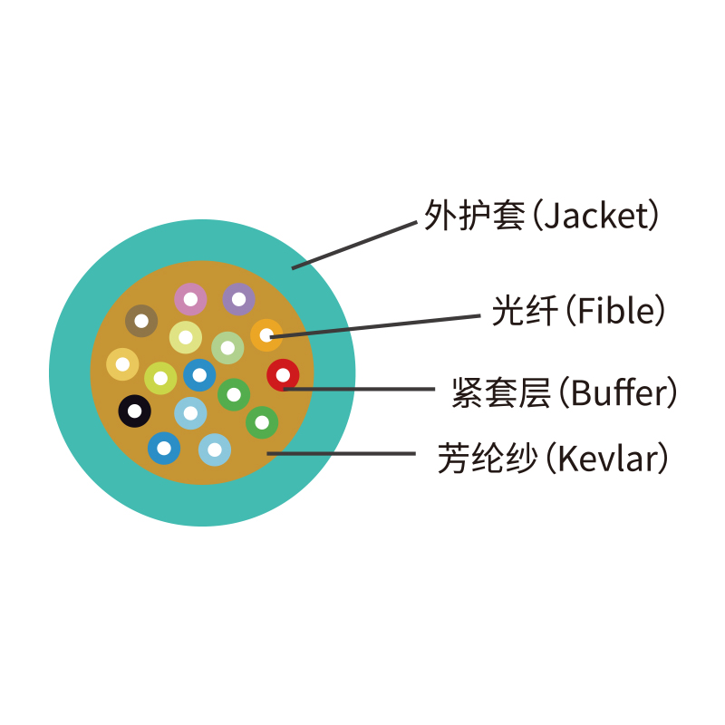 室內光纜是在緊套光纖外均勻增加加強作用的多股芳綸絲,再擠阻燃外護套而成.